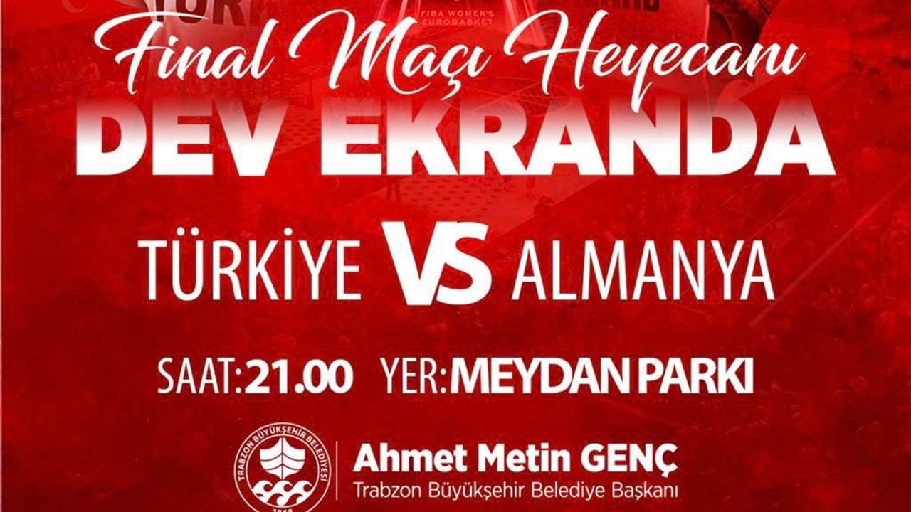 Trabzon Büyükşehir Belediyesi, FIBA 2025 Avrupa Erkekler Basketbol Şampiyonası finalinde A Milli Erkek Basketbol takımımızın bu akşam (14 Eylül Pazar) saat 21.00’de Almanya ile oynayacağı tarihi mücadele için Atatürk Alanı’na dev ekran kuruyor. Gençlik ve Spor Hizmetleri Dairesi Başkanlığı tarafından organize edilen etkinlikte, binlerce vatandaş final heyecanını tek yürek olarak yaşayacak. Trabzon Büyükşehir Belediye Başkanı Ahmet Metin Genç, tüm Trabzonluları bu heyecana ortak olmaya davet ederek, “12 Dev Adam’ı yalnız bırakmıyor, kupanın heyecanını hep birlikte yaşıyoruz” ifadelerini kullandı.