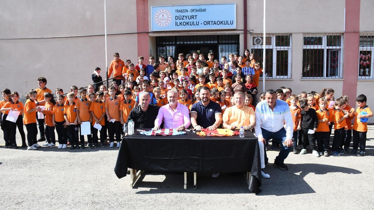 Kazaz Grup Yönetim Kurulu Başkanı ve aynı zamanda eski hakem Necati Kazaz önderliğinde gerçekleştirilen ziyarette, Trabzonspor’un efsanesi Hami Mandıralı ve Türk futbolunun unutulmaz golcüsü Tanju Çolak, öğrencilerle bir araya geldi. Ziyarette Okul Müdürü Mehmet Kara ve Düzyurt Muhtarı Lokman Mengüç de yer aldı. Kazaz Grup, okula forma hediye etti. Efsaneler, öğrencilere imza verirken bol bol fotoğraf çektirdiler.
