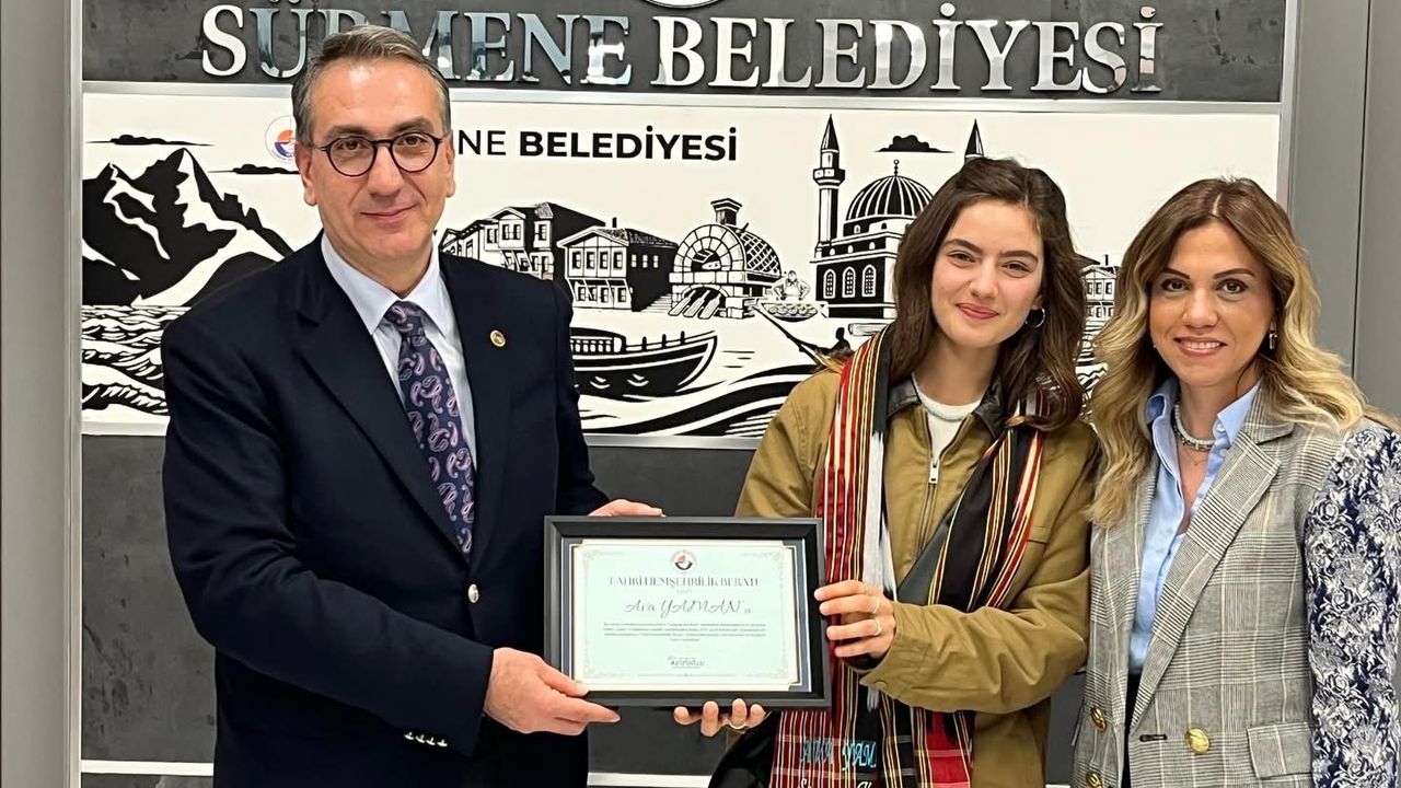Başkan Azizoğlu : Şehrimizin ve ilçemizin tanıtımına katkı sağlayan ve artık Sürmene’mizin de evladı olan Ava Yaman’a Sürmene Belediyesi “Fahri Hemşehrilik Beratı” ve plaket takdiminde bulunduk.