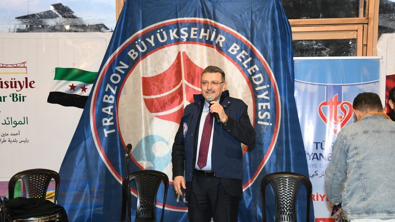 Trabzon Büyükşehir Belediyesi tarafından Suriye’nin Halep kentine bağlı Eşrefiye Mahallesi’nde Ramazan ayı boyunca kurulan iftar sofraları, yüzlerce kişiyi aynı masa etrafında buluşturmaya devam ediyor. Yardım çalışmalarını yerinde incelemek ve iftar programına katılmak amacıyla Trabzon Büyükşehir Belediye Başkanı Ahmet Metin Genç, Trabzon Valisi Tahir Şahin, AK Parti İl Başkanı Sezgin Mumcu, Ortahisar İlçe Başkanı Seyit Hisoğlu, bazı meclis üyeleri ve belediye yöneticilerinden oluşan heyetle Halep’e gitti. İftar programında konuşan Başkan Genç, Ramazan’ın birlik ve dayanışma ruhuna vurgu yaparak Trabzon’dan gelen heyetle birlikte Halep halkıyla aynı sofrayı paylaşmanın mutluluğunu yaşadıklarını ifade etti.