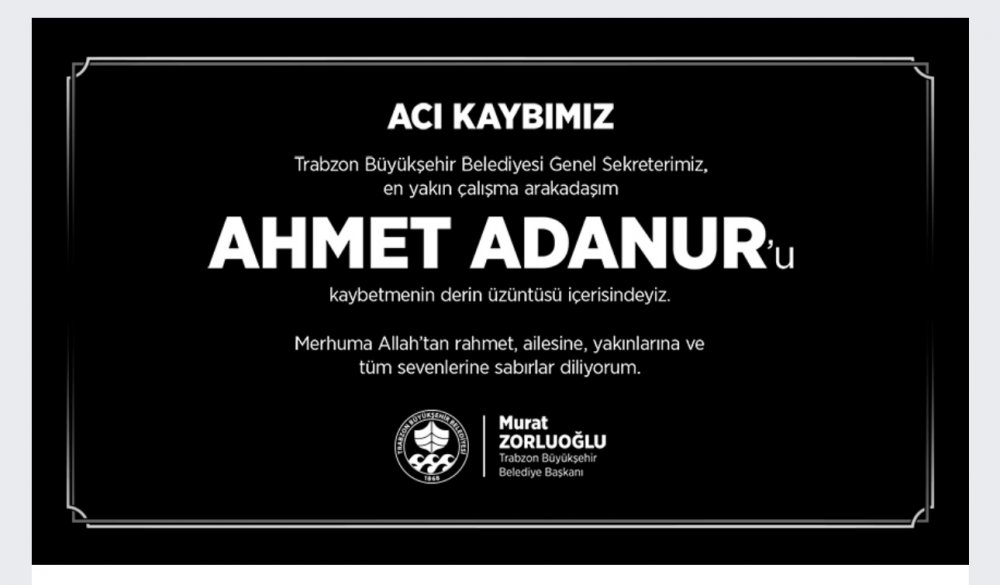 Başkan Zorluoğlu ;Genel Sekreterimiz Ahmet Adanur’u kaybetmenin üzüntüsünü yaşıyoruz.