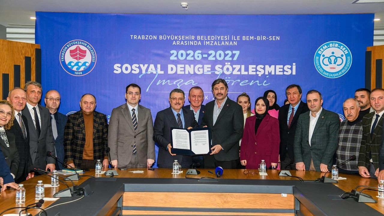Trabzon Büyükşehir Belediyesi ve TİSKİ’de çalışan 1383 memurun sosyal haklardan en üst seviyede yararlanması adına, Trabzon Büyükşehir Belediyesi Toplantı Salonu’nda Büyükşehir Belediye Başkanı Ahmet Metin Genç ve Bem-Bir-Sen Genel Başkanı Levent Uslu arasında imza töreni düzenlendi. İmzalanan protokol doğrultusunda, Sosyal Denge Sözleşmesi kapsamındaki ödemelere tavan oran üzerinden zam yapılarak memurların gelirlerinde iyileştirme sağlandı. Çalışanların menfaatini gözetmeye özen gösterdiklerini ifade eden Büyükşehir Belediye Başkanı Ahmet Metin Genç, “Bizler, Büyükşehir Belediyesi ve bağlı kurumumuz TİSKİ’de görev yapan tüm mesai arkadaşlarımızın memnuniyetini ve huzurunu her zaman ön planda tuttuk. Sosyal Denge Sözleşmesi de bu anlayışın somut bir göstergesidir. Sendikamızla uzun yıllardır karşılıklı anlayış ve empatiyle çalışıyoruz. İmkanlarımız dahilinde çalışanlarımızın menfaatini gözetmeye özen gösteriyoruz. Memur personelimizi kapsayan bu sözleşmenin hayırlı olmasını diliyor, emeği geçen sendika yöneticilerimize ve özellikle sürece bizzat katılan Genel Başkanımıza teşekkür ediyorum. İnşallah hep birlikte verimli, huzurlu ve başarılı bir çalışma dönemini Rabbim bizlere nasip eder” ifadelerini kullandı.