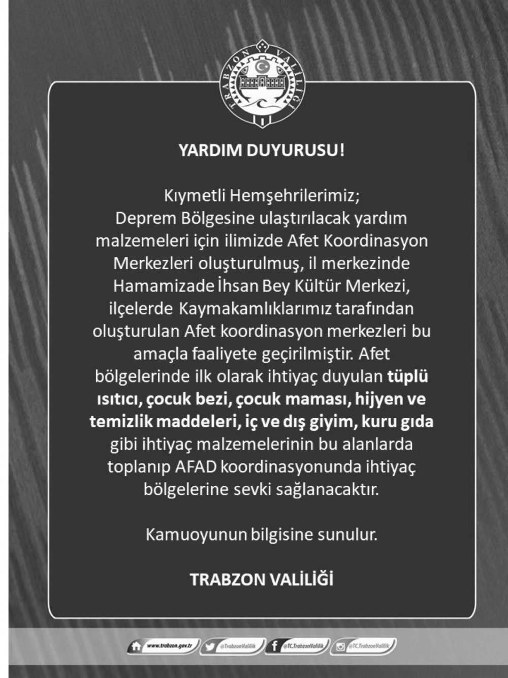 Depremzedelere destek vermek isteyen Trabzonlular için Ortahisar’da Hamamizade İhsan Bey Kültür Merkezi’nde ve ilçelerde Kaymakamlıklar tarafından Afet Koordinasyon Merkezleri oluşturuldu. Afet bölgelerinde ilk olarak ihtiyaç duyulan tüplü ısıtıcı, çocuk bezi, çocuk maması, hijyen ve temizlik malzemeleri, kullanılmamış iç ve dış giyim, kuru gıda gibi ihtiyaç malzemeleri belirtilen Afet Koordinasyon Merkezlerinde toplanarak ihtiyaç duyulan bölgelere sevk edilecektir.