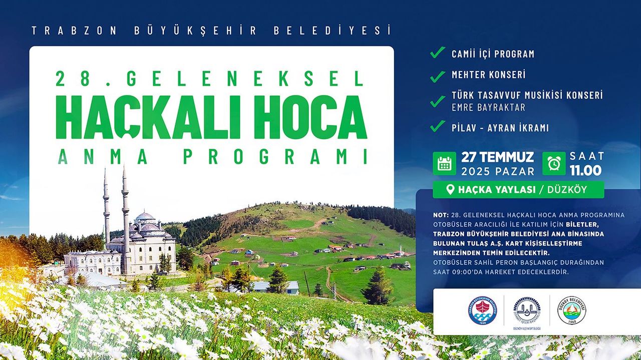 Trabzon’un Düzköy ilçesine bağlı Haçka Yaylası’nda, 27 Temmuz Pazar günü 28. Geleneksel Haçkalı Hoca Anma Programı düzenlenecek. Trabzon Büyükşehir Belediyesi, Düzköy Belediyesi ve Düzköy İlçe Müftülüğü iş birliğinde organize edilen etkinlik, saat 11.00’de başlayacak. Programa katılmak isteyen vatandaşlar için Büyükşehir Belediyesi, ulaşım kolaylığı sağladı. Katılımcıları taşıyacak otobüsler, aynı gün sabah saat 09.00’da Trabzon Moloz mevkiindeki sahil peron başlangıç durağından hareket edecek. Otobüs biletleri, 25 Temmuz Cuma günü mesai bitimine kadar Trabzon Büyükşehir Belediyesi ana hizmet binasında yer alan TULAŞ A.Ş. kart kişiselleştirme merkezinden temin edilebilecek. Ayrıca, 26 Temmuz Cumartesi günü boyunca ve 27 Temmuz Pazar günü otobüs hareket saatine kadar da sahil peron başlangıç durağından bilet alımı yapılabilecek. Vatandaşların yoğun ilgi göstermesi beklenen anma programı için gidiş-dönüş ulaşım ücreti 150 TL olarak belirlendi.