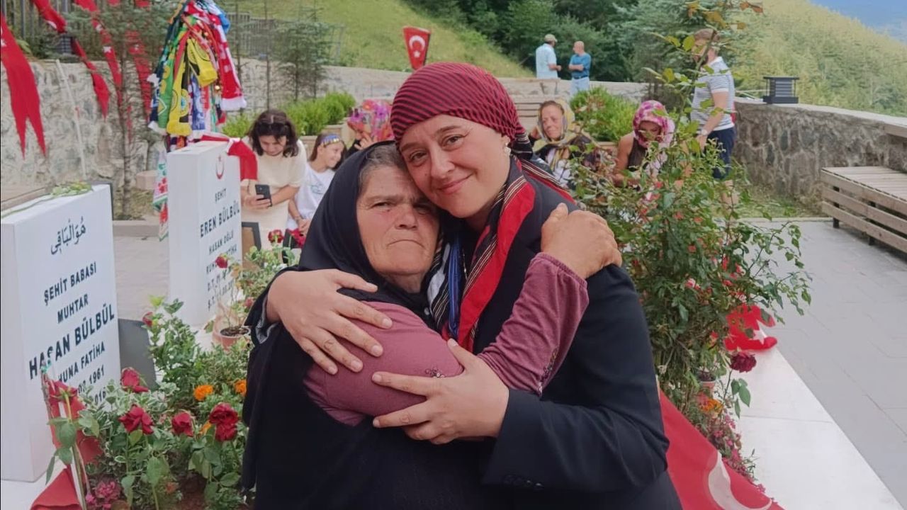 Mattia Ahmet Minguzzi’nin annesi Yasemin Minguzzi Eren Bülbül’ün annesi Ayşe Bülbül Şehit Eren Bülbül’ün mezarı başında bir araya geldiler .