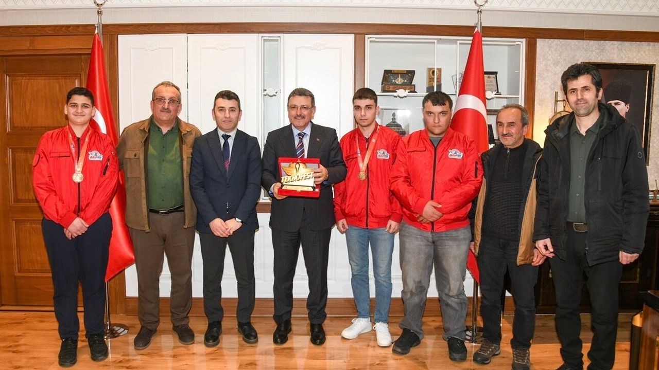 Trabzon Büyükşehir Belediye Başkanı Ahmet Metin Genç, TEKNOFEST 2025 İstanbul’da düzenlenen liseler arası mesleki yetenek yarışmasında Türkiye birinciliği elde eden Hacı Mehmet Ulusoy Mesleki ve Teknik Anadolu Lisesi öğrencilerini makamında ağırladı. Yaklaşık 200 mesleki ve teknik Anadolu lisesinin katıldığı yarışmada birinci olan öğrenciler Ali Arslan Kızıltaş, İlgan Ziğaloğlu ve Mehmet Emin Aslan, Okul Müdürü Bülent Saka ve beraberindeki heyetle birlikte Başkan Genç’i ziyaret etti. Başkan Genç, elde edilen başarının Trabzon için büyük bir gurur kaynağı olduğunu söyledi.